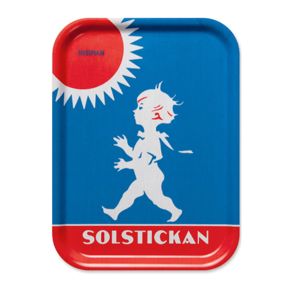 Bricka med avbildning av den klassiska Solstickepojken skapad av Einar Nerman 1936. Brickan är tillverkad i Sverige.