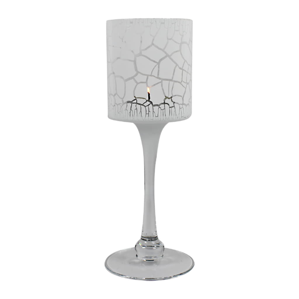 Ljuslykta i glas med vit färg och mönster sprayat upptill och klar glasfot.