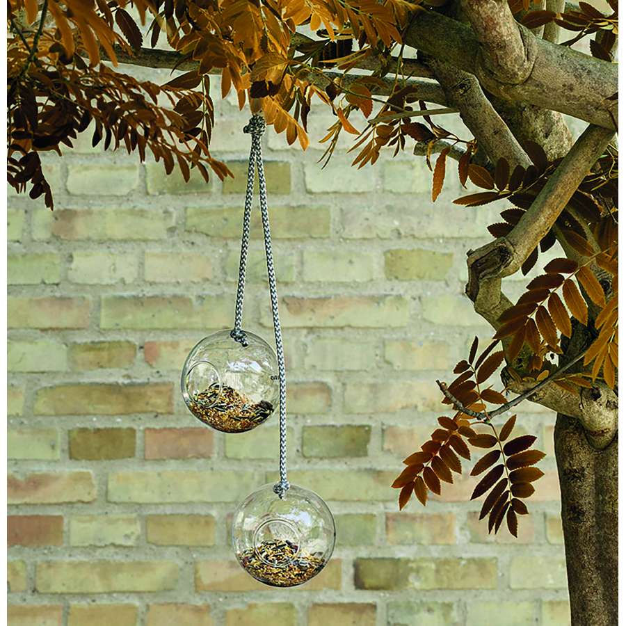 Fågelmatarna är inte bara dekorativa, de hjälper även småfåglarna genom vintern när det är ont om mat. Fågelmatarna är tillverkade av klart glas så att man kan se fåglarna när de äter. Designen gör det dessutom lätt för småfåglarna att slå sig ner på glaskanten och äta. Det är enkelt att fylla på foder i glaskulorna, som har dräneringshål i botten så att fodret hålls torrt. Fågelmatarna säljs i set om 2 st. och är bara att hänga upp i trädgården eller på altanen i de medföljande stilrena nylonsnörena. Designade för att passa med övriga produkter från Eva Solo för utomhusbruk.