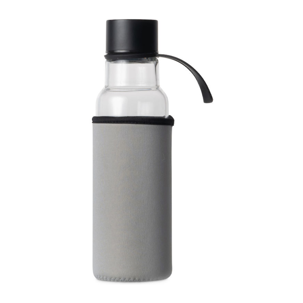Glasflaska för vatten eller annan dryck. Fodralet i grå neopren skyddar och gör flaskan mer stöttålig. Rymmer 60 cl.