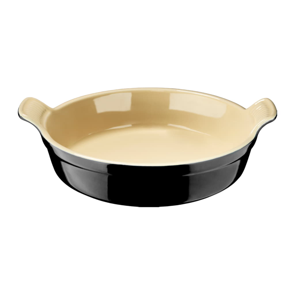 Rund ugnsform med handtag i hållbart stengods. Tål temperaturer från -23 till +260 grader. Men syäll aldrig en fryst form direkt i varm ugn. Formen finns i fyra olika färger för att passa just ditt köp och diskas sedan enkelt för hand eller i diskmaskin.