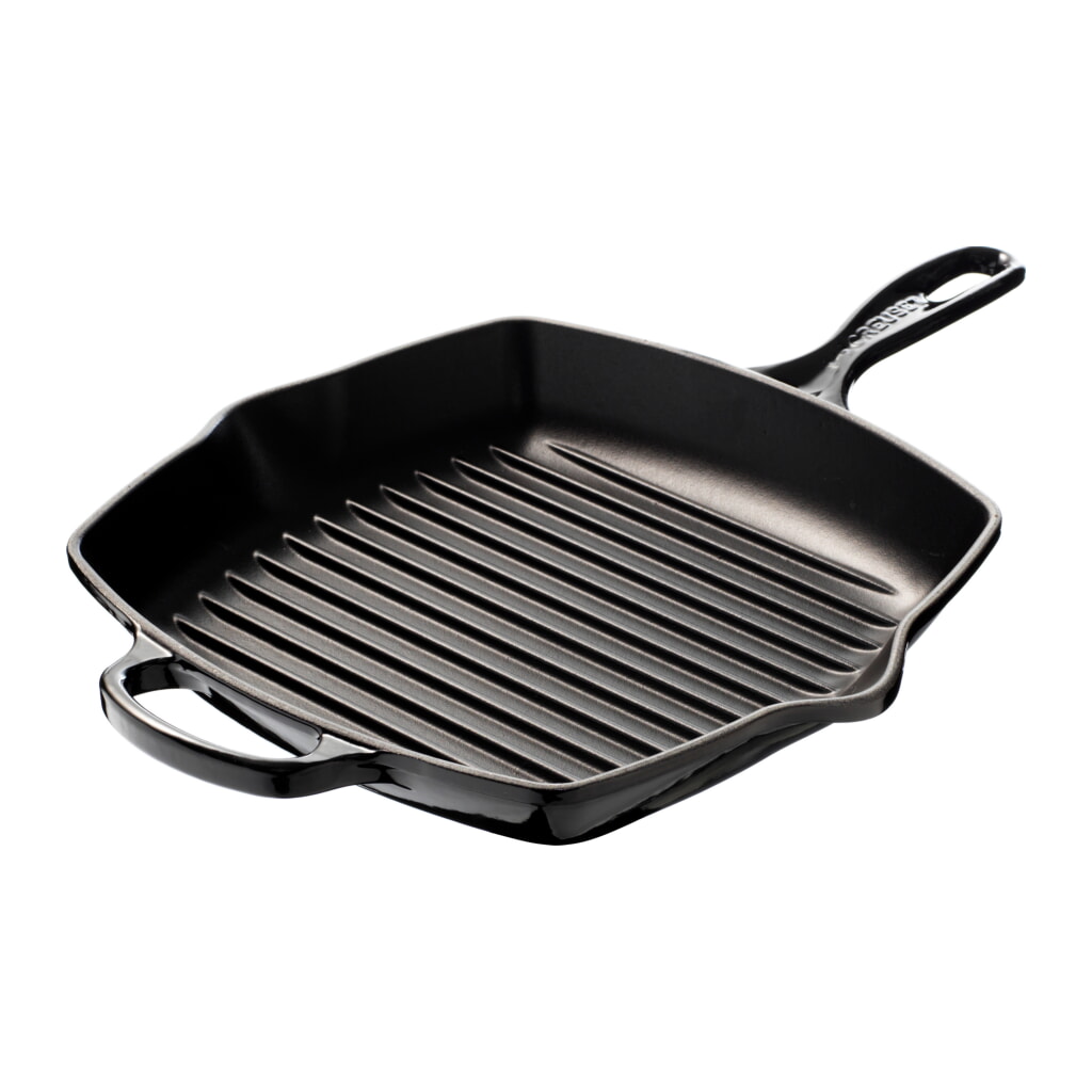 Le Creusets kvadratiska grillpanna i gjutjärn har en invändig svart emalj som är speciellt framtagen för matlagning som kräver höga yttemperaturer. Pannans kvadratiska form ger största möjliga stekyta och det integrerade hjälphandtaget gör hanteringen enkel och säker. Den räfflade ytan ger frestande grillränder på biffar, tonfisk- och laxkotletter, räkor, grönsaker eller kyckling. Grillpannan finns i ett brett urval av Le Creusets välbekanta färger så att den matchar köket och den personliga Le Creuset-samlingen. Pannan kan användas på alla värmekällor inklusive induktion och tål dessutom både ugn och att diskas i diskmaskin. Vår kunniga personal hjälper dig gärna att välja rätt.