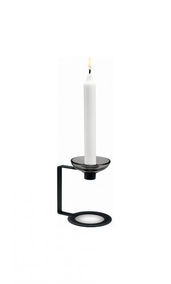 Ljusstake tillverkad i metall med svart pulverbeläggning och skålformad manschett i glas i färgen smoke. Höjd: 91 mm. Tål ej maskindisk. Design: Marie Berntsen. Art.nr 4343620