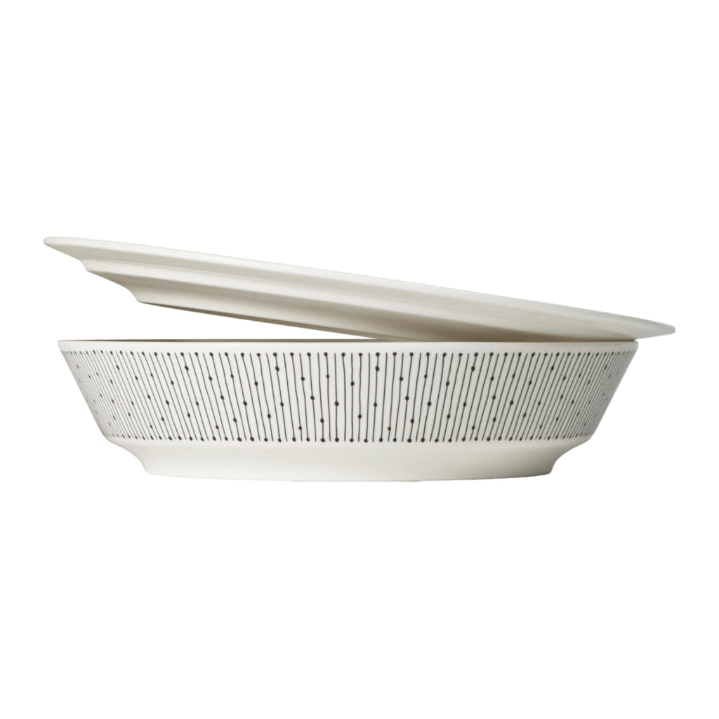 Serien Mainio Sarastus från Arabia är en servis i vitroporslin med en bård i form av organiska ränder och små prickar. Serien är stilren men lekfull på samma gång och passar både till vardag och fest. Delarna kan staplas och kombineras med varandra för nya användningsområden. Du kan tex använda tallrikarna som lock till skålarna för förvaring i kylskåpet eller frysen. Tål frys, ugn och mikrovågsugn.