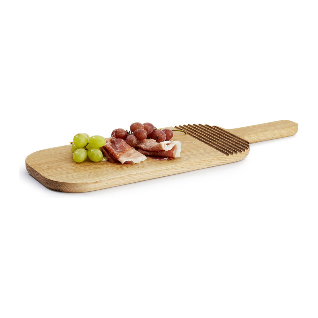 Generös skärbräda i ek med väl genomtänkta detaljer designad av Anton Björsing. Ett gediget handtag för servering som ligger bra i handen. Skåror som är en snygg design detalj och samtidigt håller verktyg på plats så att de ej glider av för enkelt. Glöm inte att olja in den med jämna mellanrum.