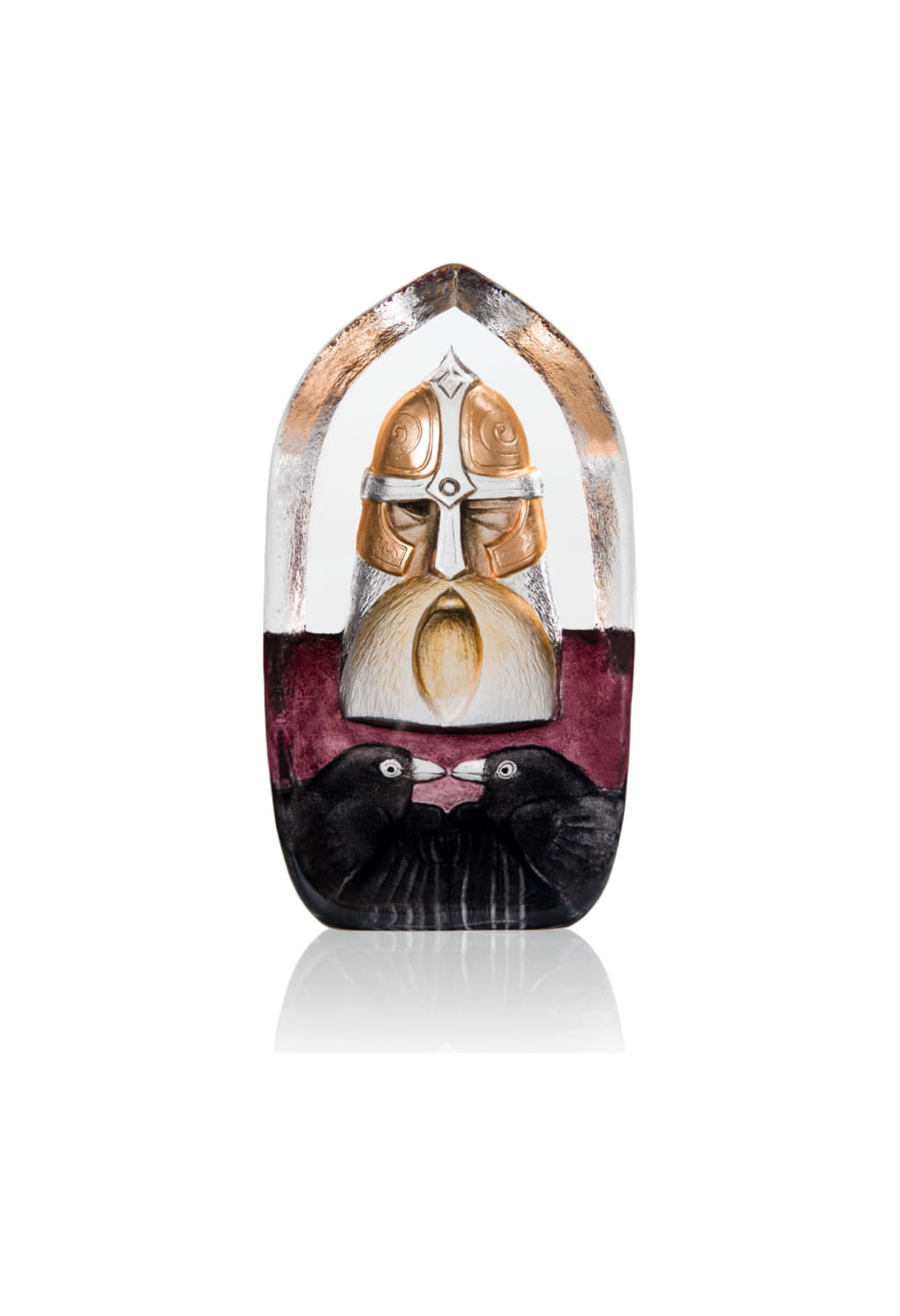 Gjutet kristallblock med sandblästrat och målat motiv av asaguden Oden. Av miljöskäl är produkten målad med organiska färger. Undvik starka medel vid rengöring. Utsätt heller inte produkten för starkt solljus. Blocket är handgjort i Målerås och signerat i botten. Blocket levereras i en presentkartong.
