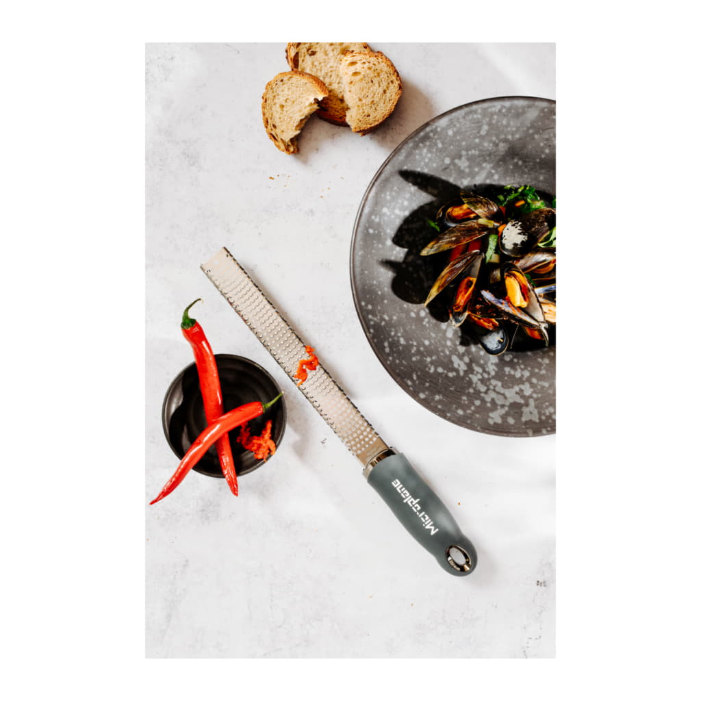 Fint rivjärn. Lämpligt för bl.a. citrusskal, vitlök, parmesan, muskot och lök. Softgriphandtag