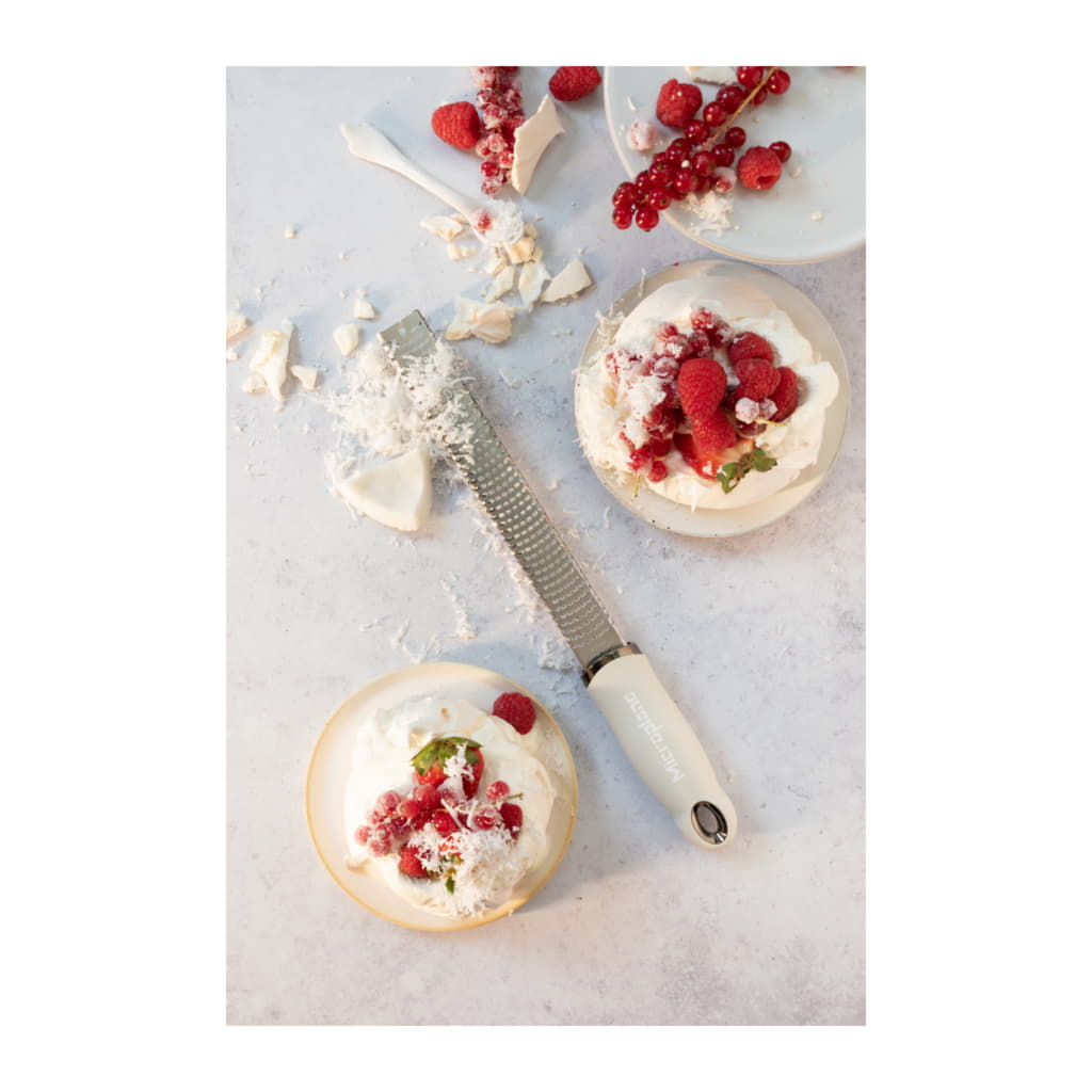 Fint rivjärn. Lämpligt för bl.a. citrusskal, vitlök, parmesan, muskot och lök. Softgriphandtag