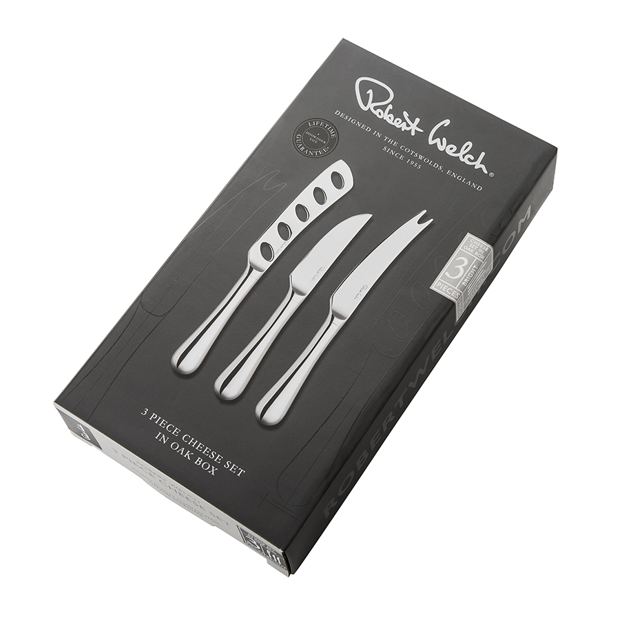 En uppsättning av 3st ostknivar med blank yta från Radford bestickserie. Levereras i en snygg ekask med grå sammet. Radford (BR) Ostknivsset Gourmet 3-del innehåller: 1x Ekask 1x Hårdostkniv 19,5cm 1x Ostkniv 22cm 1 x Mjukostkniv 22,5cm