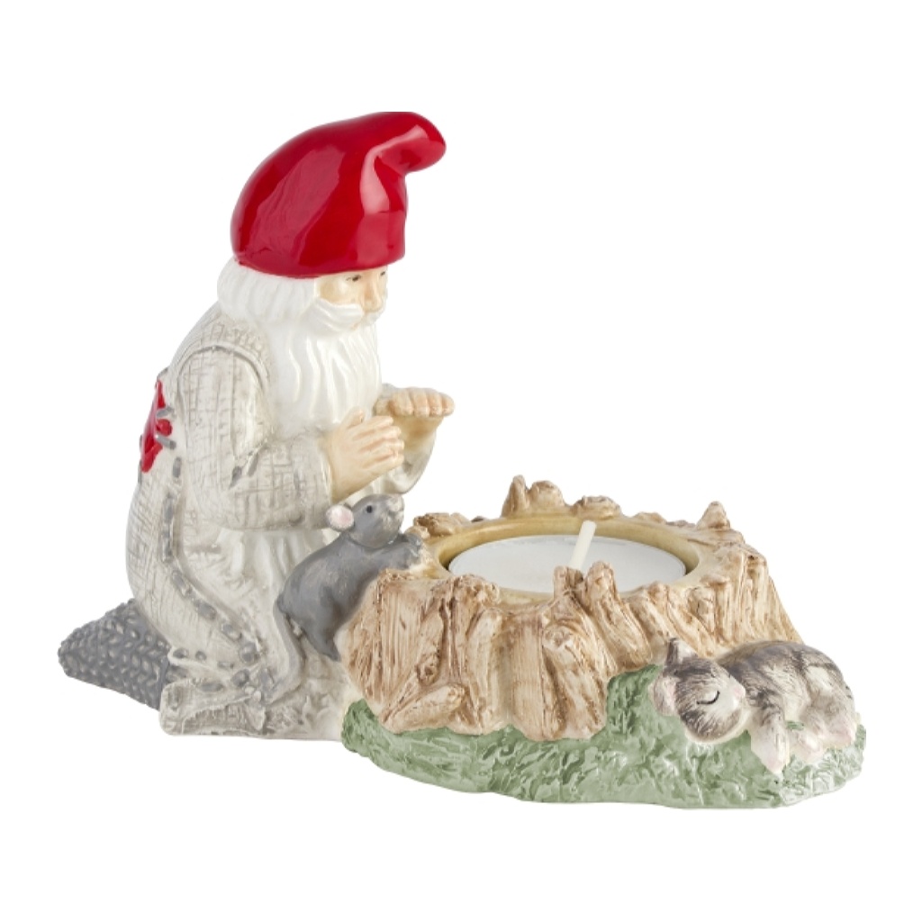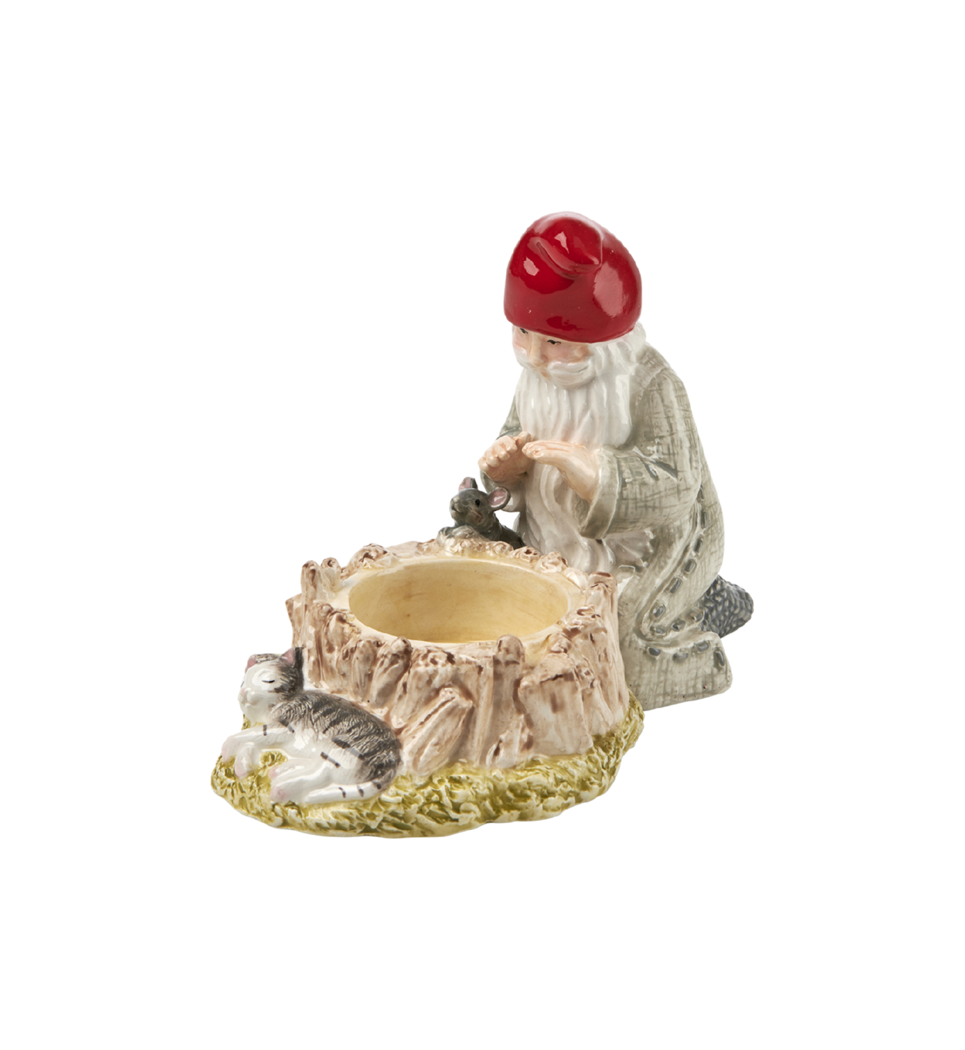 I vår designer Marita Lord´s fantasi blev tomtarna sömniga, vintern är ju så kall och mörk. De har hemmastickade raggsockar, de sopsorterar, de lappar och lagar sina nattskjortor, de tänker hållbart. Serien görs i lergods och duktiga kvinnor målar keramiken för hand.