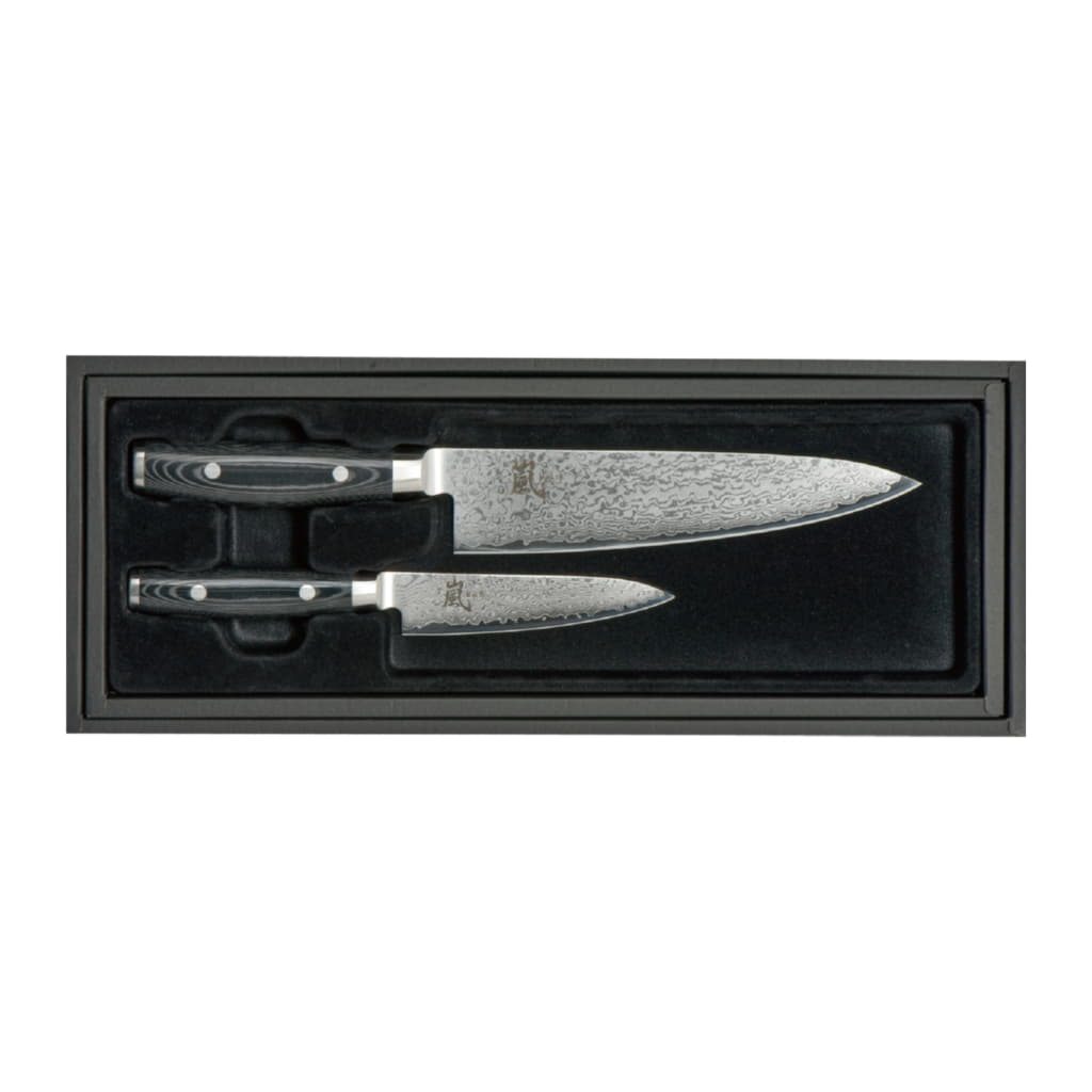 2-delsset bestående av en kockkniv 20 cm och en allkniv 12 cm. Båda knivarna har ett vackert damaskusmönster och handtag i svart Mikarta.