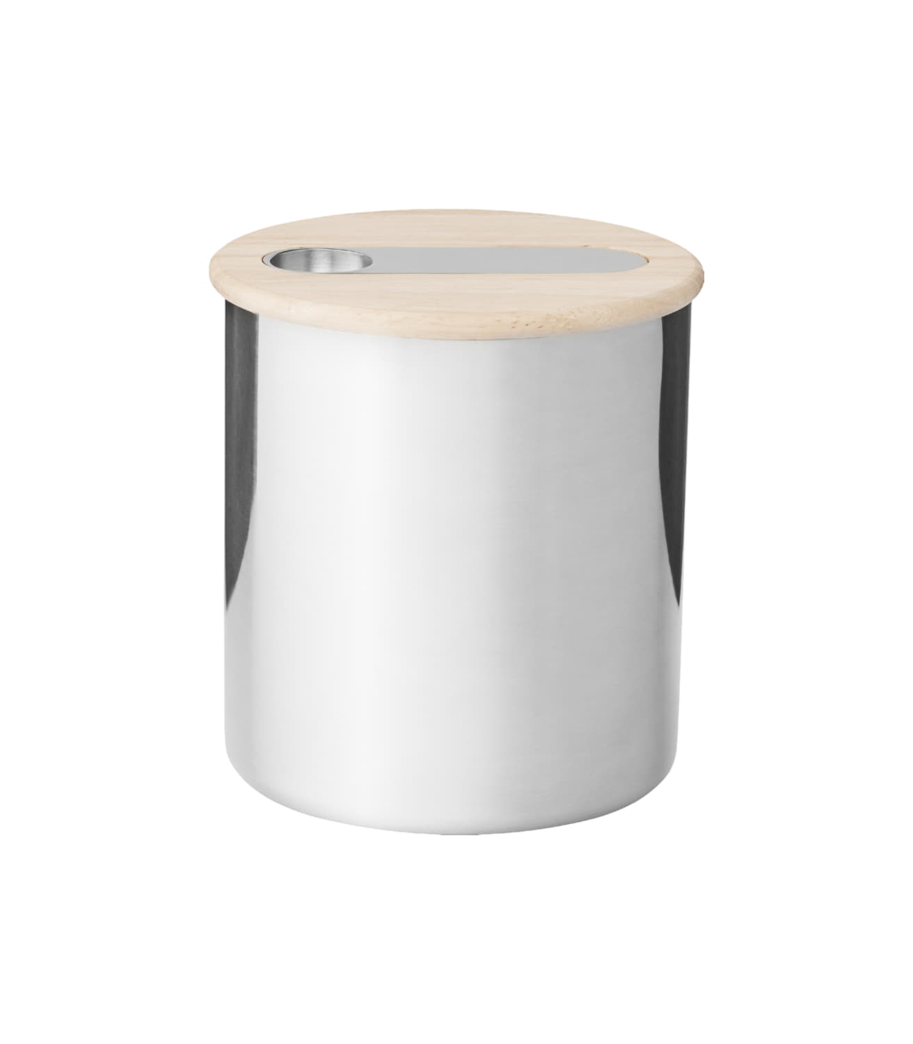 Burk i rostfritt stål med lock i gummiträ. Spceialdesignat temått ligger i trälocket.