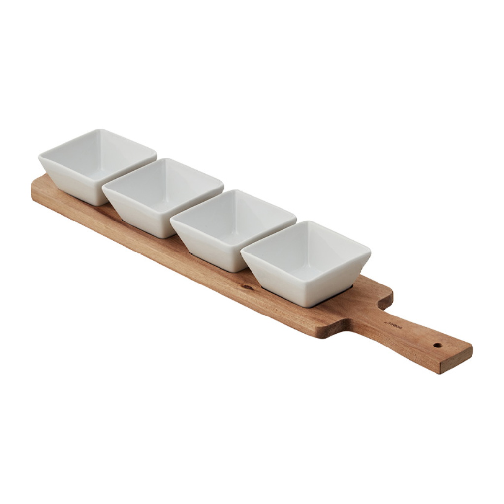 Serena avlång serveringsbricka av FSC-märkt Akaciaträ, 51×9,5×5 cm. Samt 4 skålar.