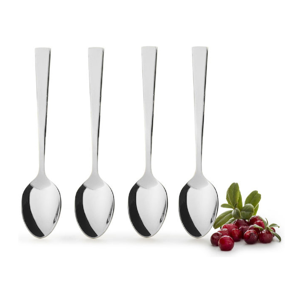 Fyra stycken silvriga teskedar av rostfritt stål.