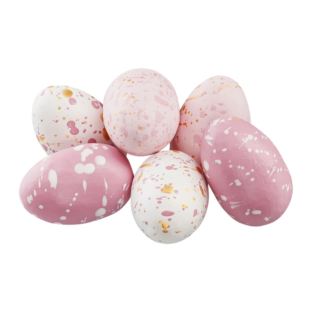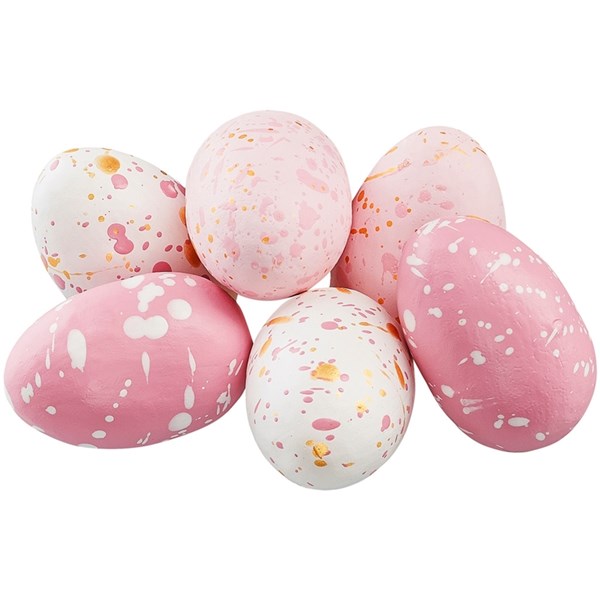 Påskserien Stänk är inspirerad av hur allmogen på 1700-talet dekorerade väggarna i hemmet. Inför högtider kalkade man väggarna, som blivit sotiga efter allt ved-eldande. Sedan tog man björkris och doppade i blåbärs- och lingonsaft och stänkte prickar på väggarna. Hönorna är målade/stänkta för hand av duktiga hantverkare så varje höna är helt unik. Med näbb och kam i guld känner de sig påskfina. Några av dem fick prickar av guld också. Material: Plast