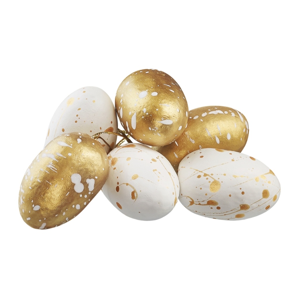 Påskserien Stänk är inspirerad av hur allmogen på 1700-talet dekorerade väggarna i hemmet. Inför högtider kalkade man väggarna, som blivit sotiga efter allt ved-eldande. Sedan tog man björkris och doppade i blåbärs- och lingonsaft och stänkte prickar på väggarna. Hönorna är målade/stänkta för hand av duktiga hantverkare så varje höna är helt unik. Med näbb och kam i guld känner de sig påskfina. Några av dem fick prickar av guld också. Material: Plast