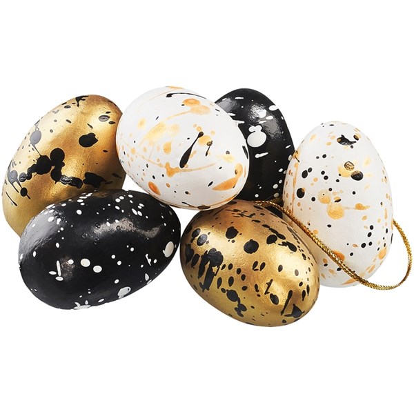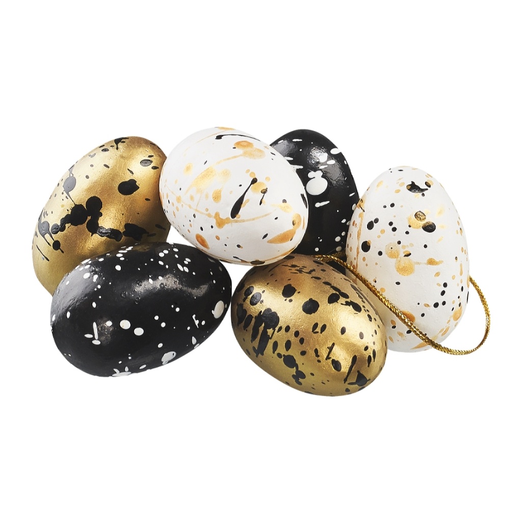 Påskserien Stänk är inspirerad av hur allmogen på 1700-talet dekorerade väggarna i hemmet. Inför högtider kalkade man väggarna, som blivit sotiga efter allt ved-eldande. Sedan tog man björkris och doppade i blåbärs- och lingonsaft och stänkte prickar på väggarna. Material: Plast