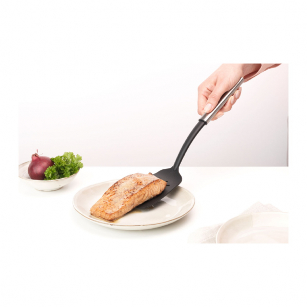 Ägg, kött, ugnsrätter… Vänd dem och servera dem med denna Brabantia Non-Stick Stora Stekspade. Denna robusta stekspade har smarta skåror genom vilka fettet lätt kan rinna av. Och den är tillverkad av elastisk nylon, så den är säker även för kokkärl med non stick-beläggning. Vändning till det bättre!