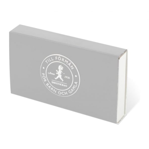Designad tändsticksask med stilfullt emblem på framsidan och repeterande mönster på baksidan med avbildning av den klassiska Solstickepojken skapad av Einar Nerman 1936. Tillverkad i Tidaholm, Sverige.
