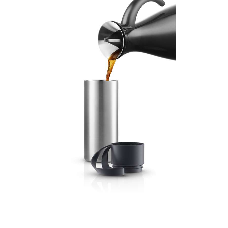 Den praktiska termosmuggen To Go Cup kan tas med överallt. Locket är lätt att öppna och stänga i farten tack vare klickfunktionen som enkelt kan hanteras med en hand. Fyll To Go Cup med kaffe eller någon annan dryck – den håller värmen eller kylan perfekt tack vare dubbla väggar och vakuumeffekt. Den praktiska bärremmen i silikon gör det lätt att ta med flaskan så att man alltid har något att dricka inom räckhåll.