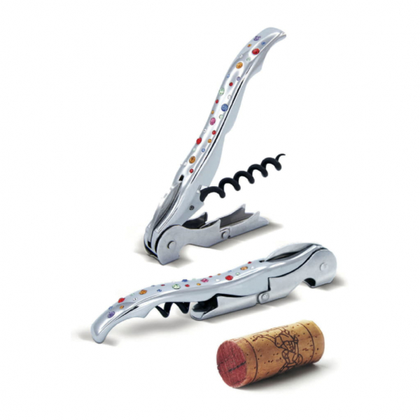 Läcker vinöppnare prydd med 26 st färgade stenar från Swarowski. Levereras i ett snyggt silkesklätt läderetui.