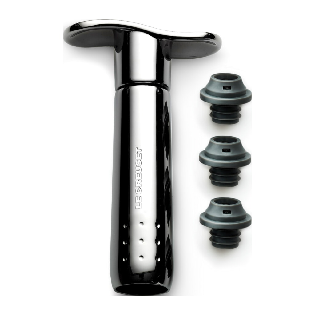 Le Creusets vinpump avlägsnar effektivt luften ur flaskan efter att den har öppnats. Vakuumeffekten förlänger och bevarar vinets smak och arom så att det håller sig flera dagar efter att det har öppnats. Vinpumpen passar till de allra flesta vinflaskor och är särskilt praktisk i små hushåll eller vid vinprovningar när vinet dricks under flera dagar. Efter att vinflaskan har öppnats bör den förvaras stående i kylen eller i en mörk och sval källare. I förpackningen medföljer tre vakuumkorkar. Vår kunniga personal hjälper dig gärna att välja rätt.