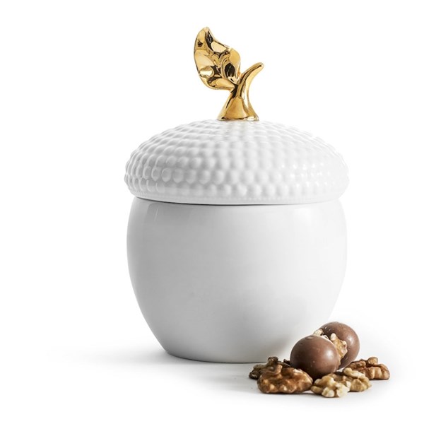 Burk av vit keramik med lock. Dekorativt formgiven som ett ekollon, med bladet i guldfärg.