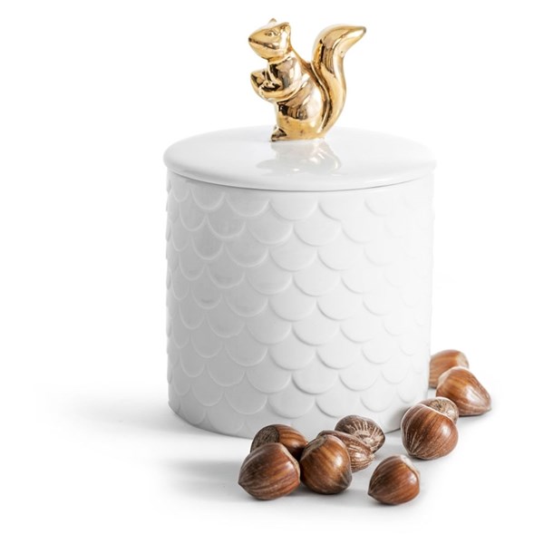 Fin burk med lock i vit keramik och med dekorativ guldfärgad ekorre. För dekoration och förvaring.