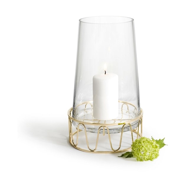 Dekorativ hög ljuslykta med guldfärgat metallunderrede och vackert glas.