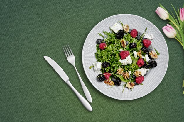 1. Lägg ruccolan på ett serveringsfat. Ringla över olivolja och balsamvinäger, salta och peppra. Strö över bären och smula över getost